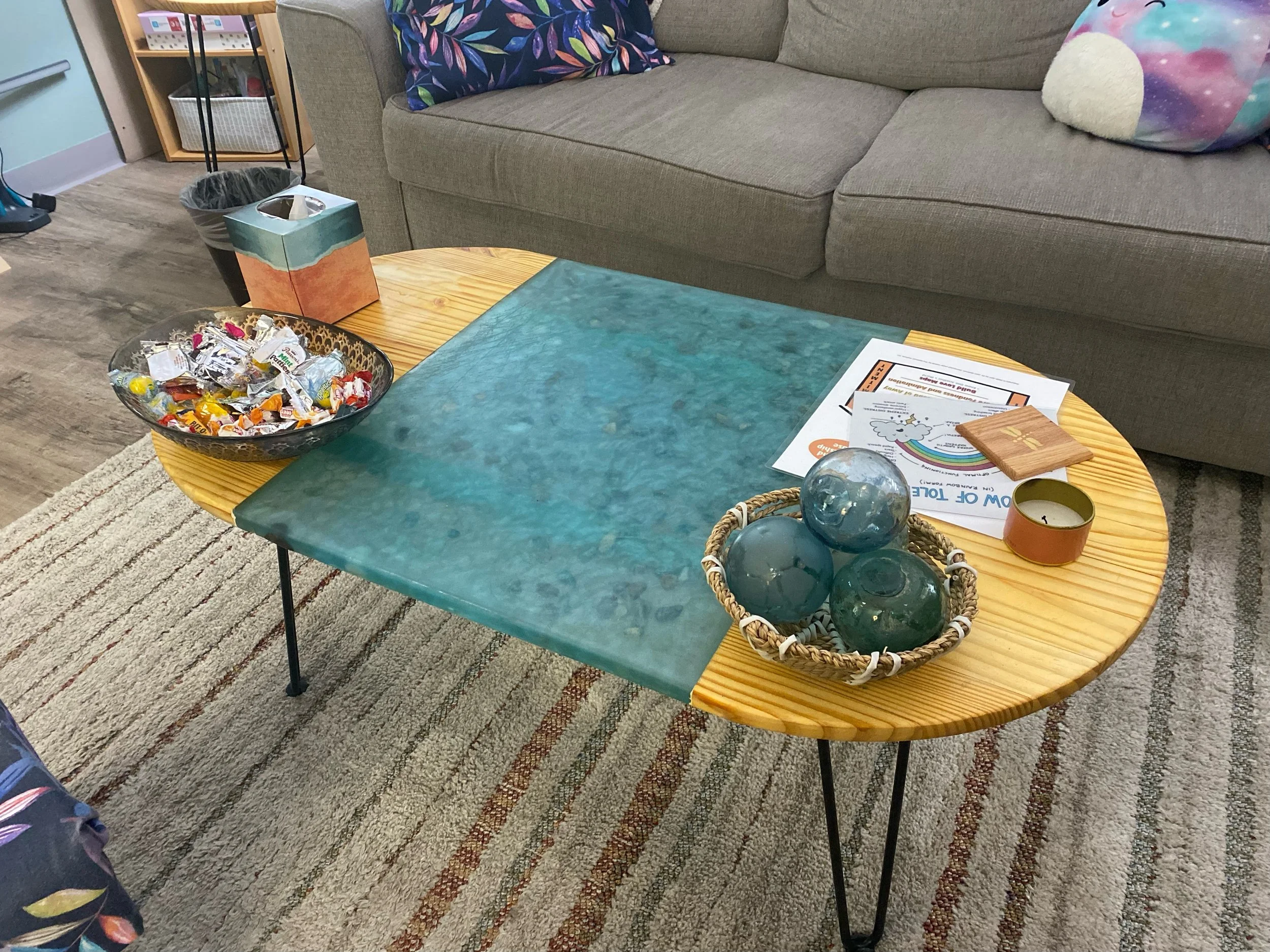 A Coffee table made with white pine and epoxy resin, the client made an interesting choice and wanted to add rocks and glass beads to the epoxy. This adds a gorgeous river bottom vibe, accenting the room it was placed in perfectly.
